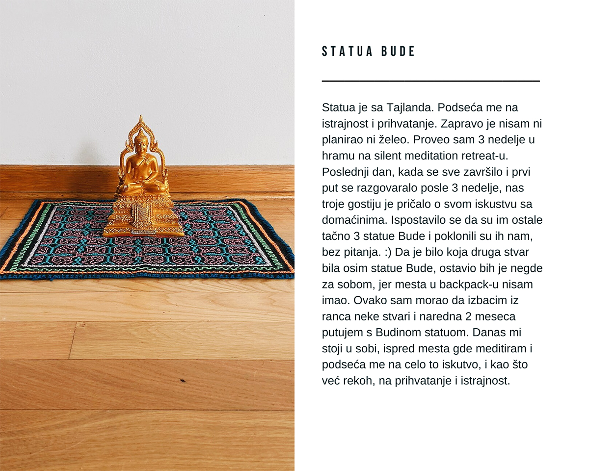 Privikavajući se na nove uslove života i nemogućnost putovanja, bar ne u nekoj bližoj budućnosti, postajemo okruženi uspomenama i, omamljeni nostalgijom, okrećemo se njima. Spremili smo vam novu seriju članaka kroz koje će naši sagovornici da izdvoje par artefakta, sitnica koje čuvaju s putovanja i ispričaju nam priču o njima a posledično i mestima koja su obišli i iskustvima koja su doživeli.