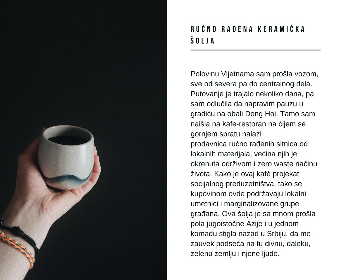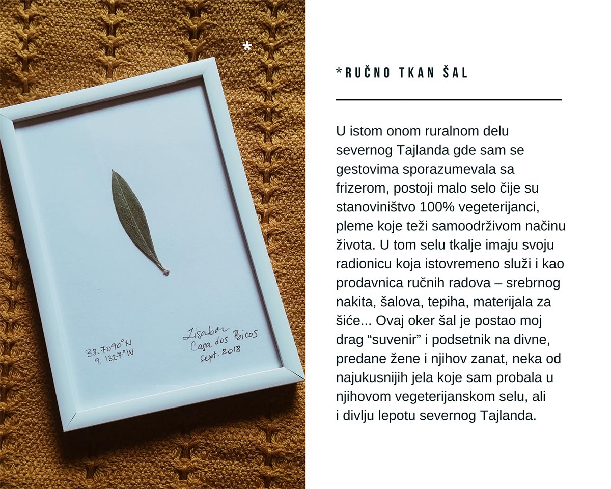 Verujem u minimalizam i ne volim da posedujem stvari koje mi ili ne koriste, u smislu da mi ne čine život lakšim ili nemaju određenu emotivnu vrednost. Iz tog razloga ne volim niti kupujem klasične suvenire kada putujem. Uvek se trudim da to budu stvari koje su karakteristične za destinaciju i usko vezane za moja interesovanja i ličnost. Neretko su to pokloni koje dobijam od lokalaca, oni uvek imaju najveću emotivnu vrednost. Ako bih bila potpuno iskrena, moje najvrednije uspomene s putovanja su one koje čuvam u svom umu, mentalne slike i iskustva koja su ostala duboko urezana u mom sećanju, a ne materijalne stvari. Ipak, želela bih da izdvojim par sitnica koje su mi veoma drage i bliske srcu, i koje me uvek podsete na neke divne trenutke i lokacije širom naše planete.