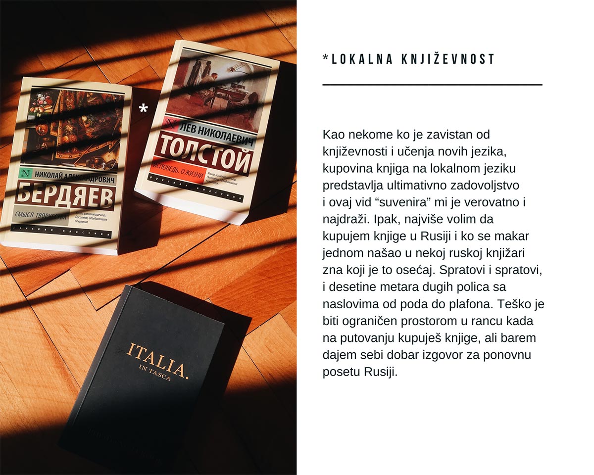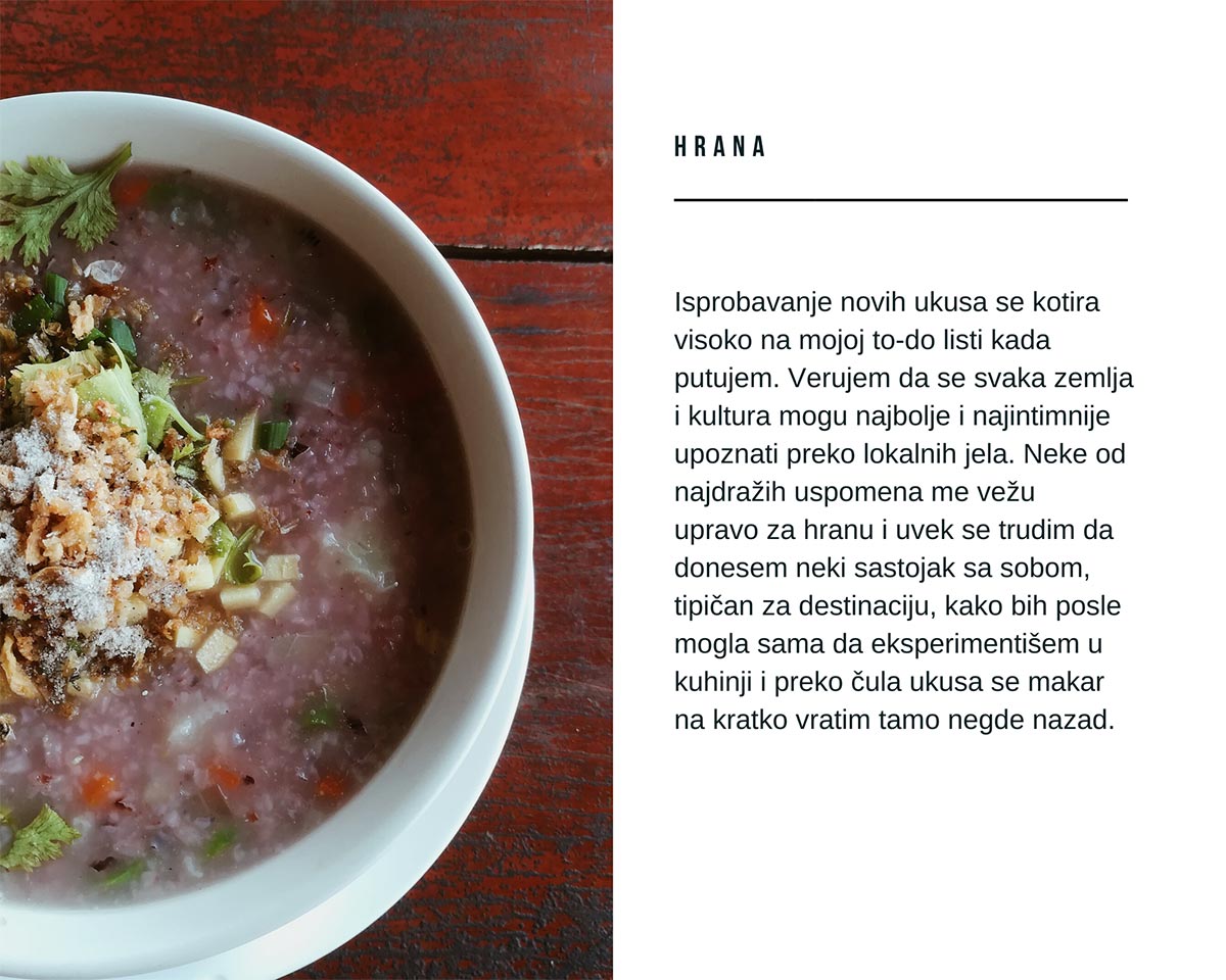 Putovanja su za mene način života i strog, ali najdraži učitelj, onaj koji najviše nagrađuje. Iako je trenutno nemoguće putovati, sve one lekcije, iskustva i uspomene koje sam proživela na putu su sada uvek sa mnom, postale su neodvojivi deo moje ličnosti. Sada, kada ne mogu da putujem, sećam se kakav osećaj ostavlja koža slona na mom dlanu, koju sam prvi put dotakla u Aziji, ili kako izgledaju toskanska sela kada ih upoznaješ jašući konja. Sećam se kako je emocija koju prenose muški igrači flamenka na ulicama Sevilje jača i nabijenija od one koju prenose žene. Kako je izlazak sunca zaista magičniji iznad hramova u Angor Vatu. Kako sam se sporazumela gestovima sa lokalnim frizerom koji ne zna ni reč engleskog, a ja pak ni reč tajlandskog, u ruralnom delu severnog Tajlanda. Kako sam stajala na samom rubu Evrope, u Portugalu i gledala talase Atlantskog okeana kako besne o strme litice. Kako sam se bespovratno zaljubila u život u Kopenhagenu i naučila da je skroz u redu udovoljiti svojim željama. Kako sam doživela najčistiju ljudsku interakciju sa lokalcima u Vijetnamu i brala čaj na poljima u severnom Tajlandu. Kako je posle svake pređene kaldrme, svake pojedene paste i popijene čaše vina rasla moja ljubav prema Italiji i kako sam upijala njihov životni optimizam. Sećam se da su mi suze nehotice išle niz obraze od sve te lepote kada sam se susrela prvi put sa peterburškom arhitekturom i višečasovnim zalascima sunca, prouzrokovanih belim noćima. I kako sam vozila kajak Nevom u praskozorje. Da li mi je žao što je sve ovo stalo? Naravno da jeste, ali čvrsto verujem da je to samo privremeno. Na kraju krajeva, i iz ovog statičnog perioda u životu možemo i treba štošta naučiti.