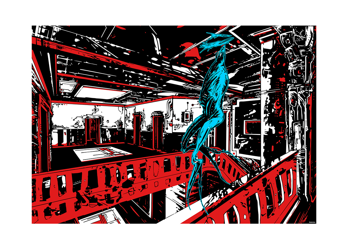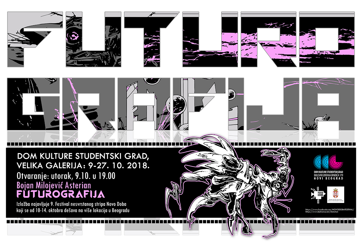 Izložba Futurografija predstavlja trideset novih grafika velikog formata Bojana Milojevića – Asteriana, ilustratora i grafičkog dizajnera koji crta i piše naučno fantastične stripove. Pored osnovne konstrukcije prizora u vidu jakih kontrasta na grafikama se mogu zapazati polja/oaze sačuvane za boju. Motivi najpre dolaze iz polja anticipacije, iz sfere naučne fantastike i šire – fantazije, ali i iz sfere buke i meteža underground estetike. Iz te dve oblasti, jedne koja još uvek ne postoji (sf) i druge (underground), koja jedva da postoji ili postoji privremeno, dolaze gradivni elementi za jedan oštar i hladan svet racionalnosti, svet koji je takođe i svet apsurda i znatiželje. Ruku pod ruku, transhumanistički prizori novog sveta, nelogična arhitektura, neosapiensi, zaumni hologrami, opskurni singulariteti i katastrofične vizije mutantskih klanica nagađanjem razotkrivaju skelet novog doba. Naznačeni i naslućeni, visoko šifrovani i zamućeni, nacrti iz suterena limbičkih mreža bića demonstriraju neophodnost suženja svesti kao uslova ljudskog postojanja i pokazuju smer za prevazilaženje ograničenja kroz gotovo fanatičnu veru u nove slobode i sposobnosti koje bi nove tehnologije trebalo da otključaju. Ovo su grafike obećanja, najave promena, duhovne, biološke, hemijske i energetske revolucije, dalje pokazuju redukciju – kao sveti imperativ svakog komunikacijskog oružja, viralnost i neophodnost prihvatanja, odbacivanje kao neophodnost rasta. Cyberpunk, psychopunk, raypunk se alhemijski rastapaju u apstrahovanju jer budućnost uvek mora biti iza ćoška, a ne evidentna. Ljudska memorija je augmentovana, izazvana, a ovo su dokazi njene fluidnosti, tehnovizije kiborga, bajalice droida druida, upozorenja iz daleke budućnosti.