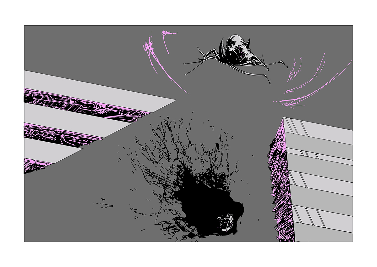 Ovo što crtam su specijalni prizori koji prelamaju priču neke epizode stripa, posebni  kadrovi koji razotkrivaju neku misteriju koju su autori stripa, gradeći kičmu priče, odgađali kroz stotine stranica, misteriju koja je rasla njhovom sposobnošću da zaintrigiraju i održavaju našu radoznalost. Iz kadra u kadar nekog stripa smenjuju se razgranati oblaci razgovora, šetnje, silaženje niz stepenice, pozivanje taksija, juranjava kolima, istresanje pepela cigarete u pikslu, a onda – BUM! preko cele strane ili čak dve: gigantska laboratorija ispod površine zaleđenog jezera, raspeti sajber Hrist skriven u glavi Statue Slobode, horda ljigavih mutanata koja vrišti dok se davi u fekalijama, sve ono što smo naslućivali ili nismo ni sanjali, konačni ključ. Monstruozna kompresija senzacionalnog u trenutku razotkrivanja, prelomne akcije, prizor nemogućeg, i mogućeg i nemogućeg u klinču u grču u ljubavnom zagrljaju. Da bi takve stranice bile posebne, potrebno je najpre preći preko svih onih običnih koje nam pripremaju mesto za nju, one sve osmišljavaju, kontekstualizuju, prodaju nam osećaj realnog. Kvalitetna odmerena kompresija, iznenada ustupa mesto bilbordskoj nametljivosti, priča se transformiše a radnja ubrzava. Takvi trenuci su posebni, samo njih pokušavam da gradim kroz svoje grafike, i dalje, kako više takvih prizora sjediniti, ogoliti, kompresijom naći obličje tvde srži, osnovu osnove.