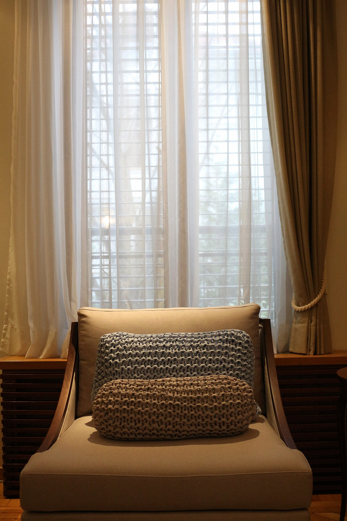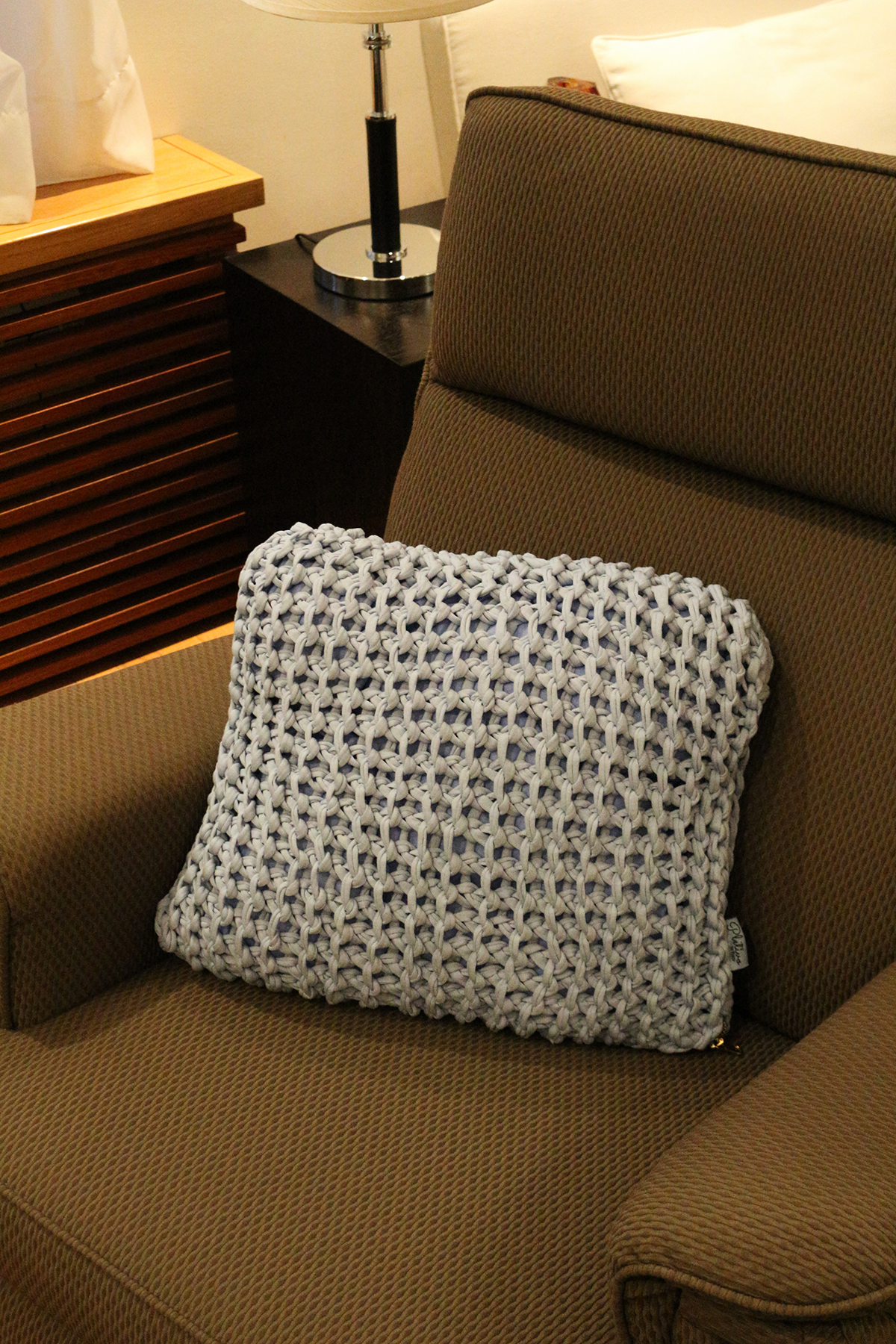 Reciklirani pamuk je materijal koji nas je osvojio svojim izgledom, praktičnošću i formom ali i činjenicom da sve i da poželimo da ponudimo serijsku proizvodnju a ne želimo, svako klupko poseduje svoj karakter usled čega boja može varirati. Jastuci su nakon pletenja ispunjeni prirodnom vunom ovčica sa domaćih farmi, kupljene direktno od proizvođača. Svaki jastuk poseduje metalni rajsferšlus koji omogućava jednostavno skidanje i vraćanje navlake radi pranja.