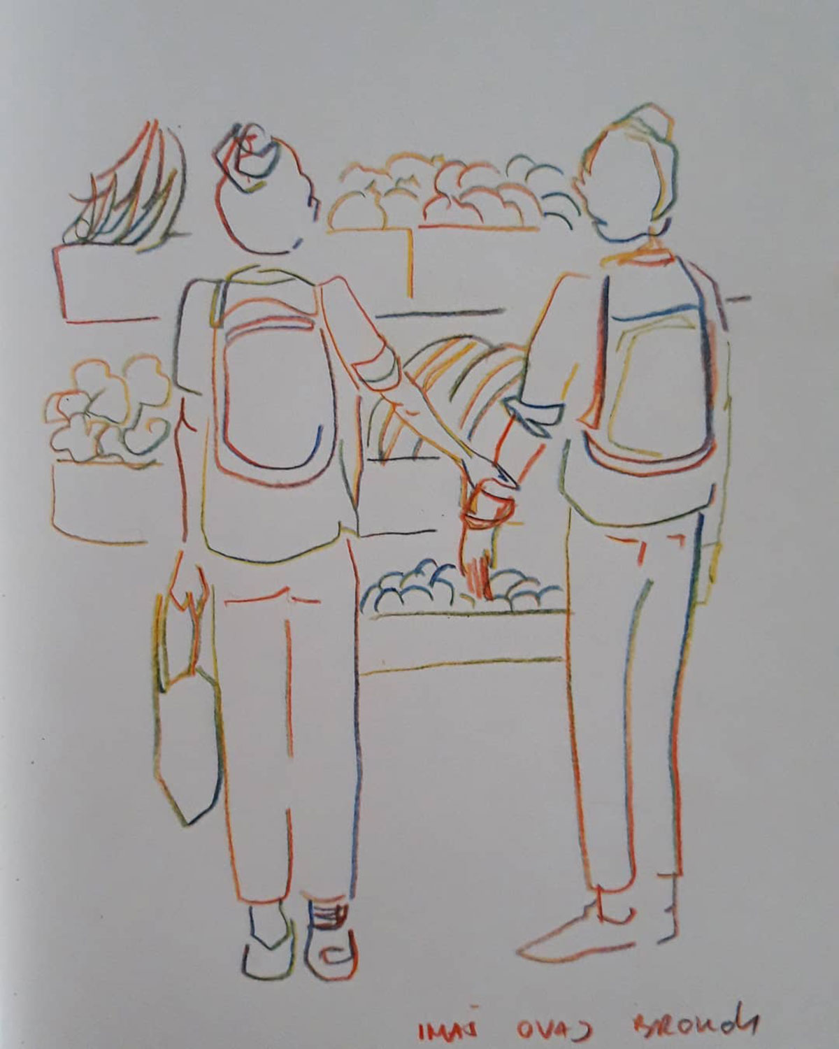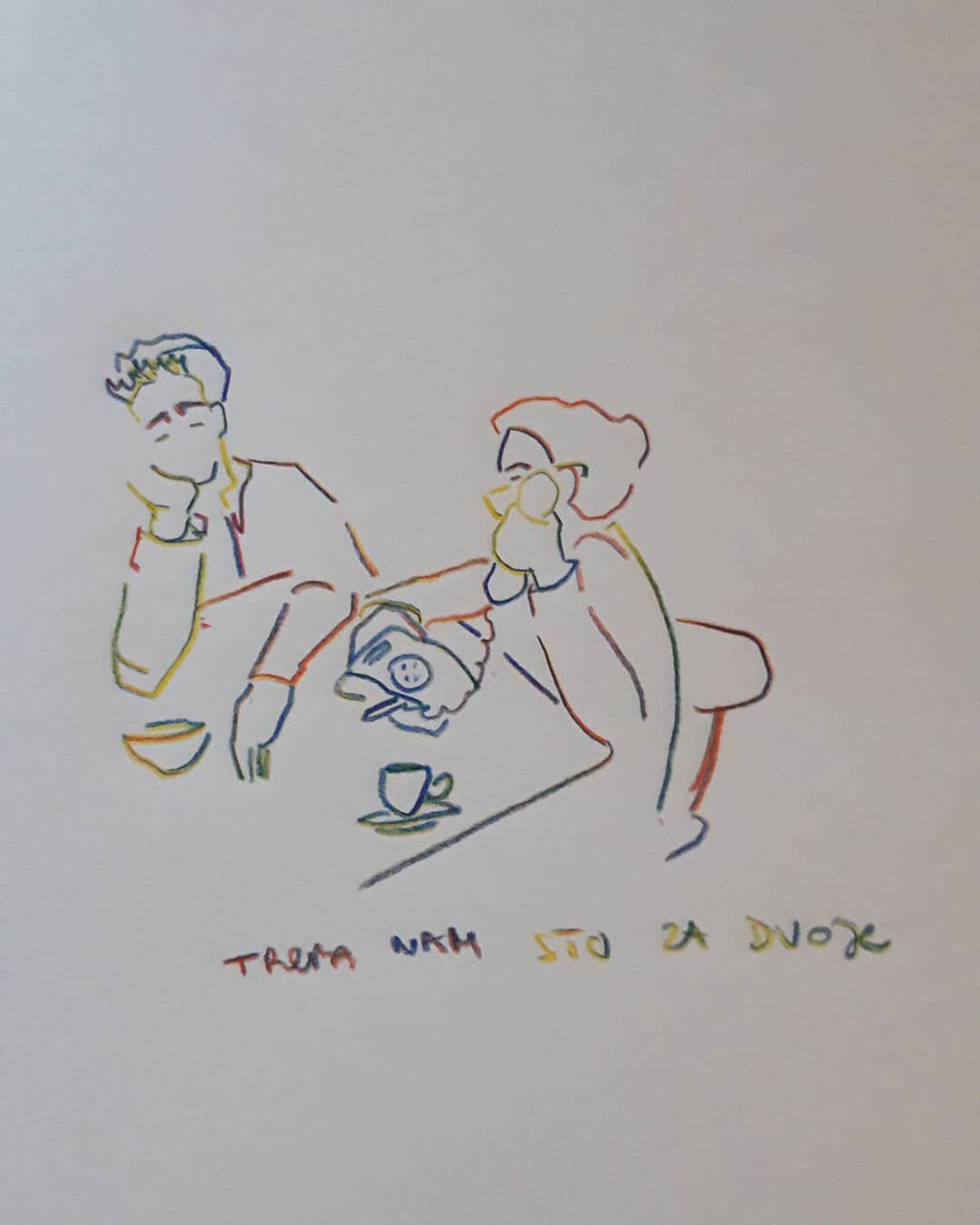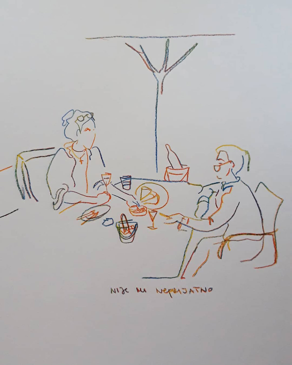 Na papiru nisu prikazane samo intimne ljubavne scene parova, mogu se videti i dnevni rituali, ispijanja kafa, čitanje, i poštovanje sebe, kao i uživanje u samoći onda kada smo na nju svi bili svedeni. U galeriji smeštena je i stolica u koji se možete smestiti i listati veliku svesku ispunjenu Jeleninim crtežima.
