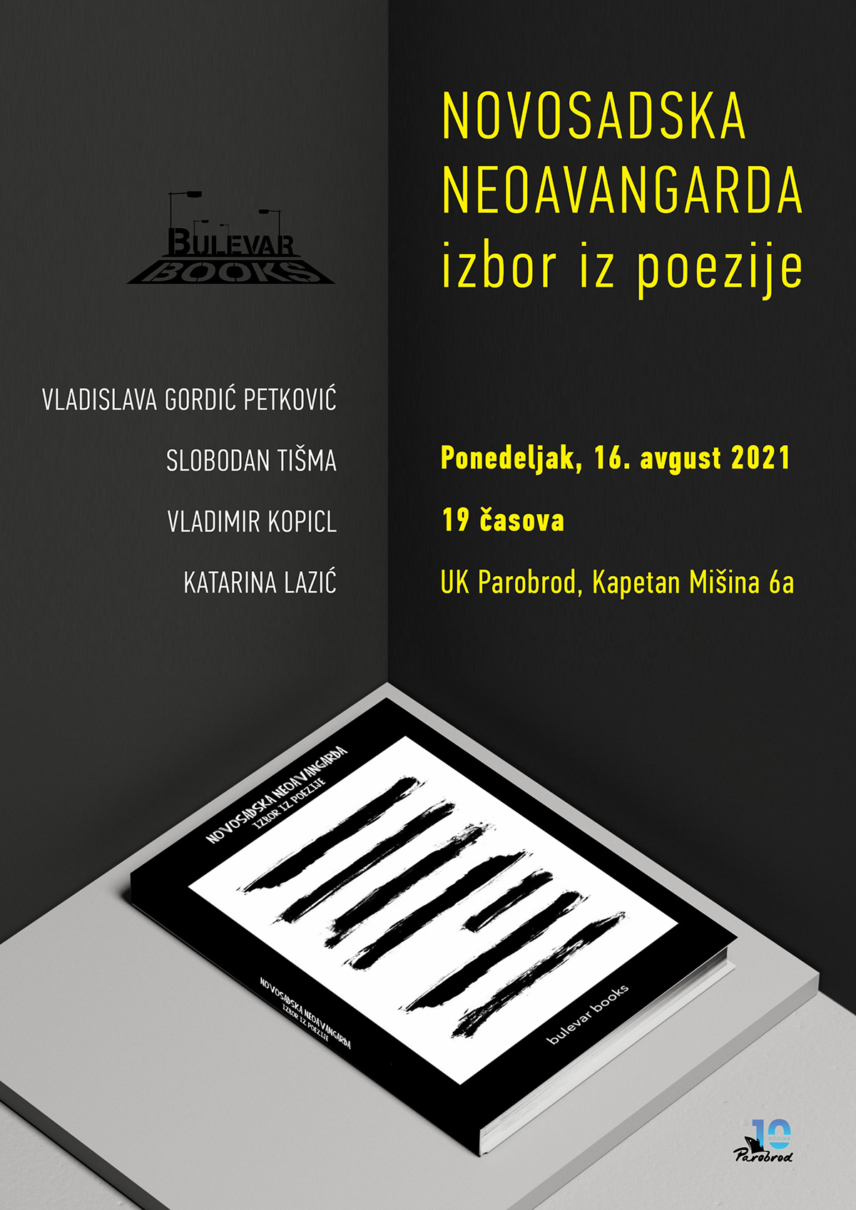 O „Novosadskoj neoavangardi – izboru iz poezije’’ (Bulevar books, Novi Sad, 2021 uredila Vitomirka Trebovac) u ponedeljak, 16. avgusta od 19 časova u UK Parobrod, Kapetan Mišina 6a, razgovaraće Vladislava Gordić Petković, profesorka filozofskog fakulteta i književna kritičarka, pesnici Slobodan Tišma i Vladimir Kopicl iz Novog Sada, uz moderiranje Katarine Lazić, urednice u Parobrodu.