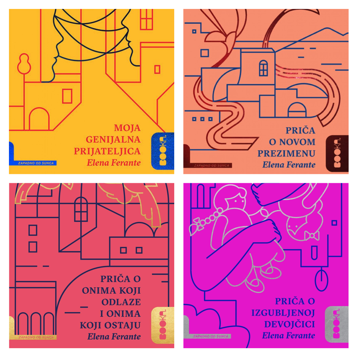Elena Ferante, „Moja genijalna prijateljica”, „Pričao o novom prezimenu”, „Priča o onima koji odlaze i onima koji ostaju” i „Priča o izgubljenoj djevojčici”
