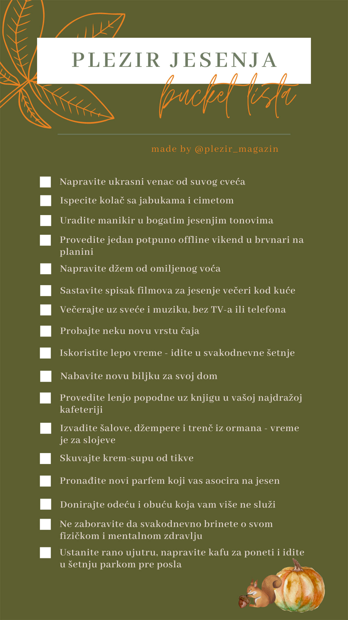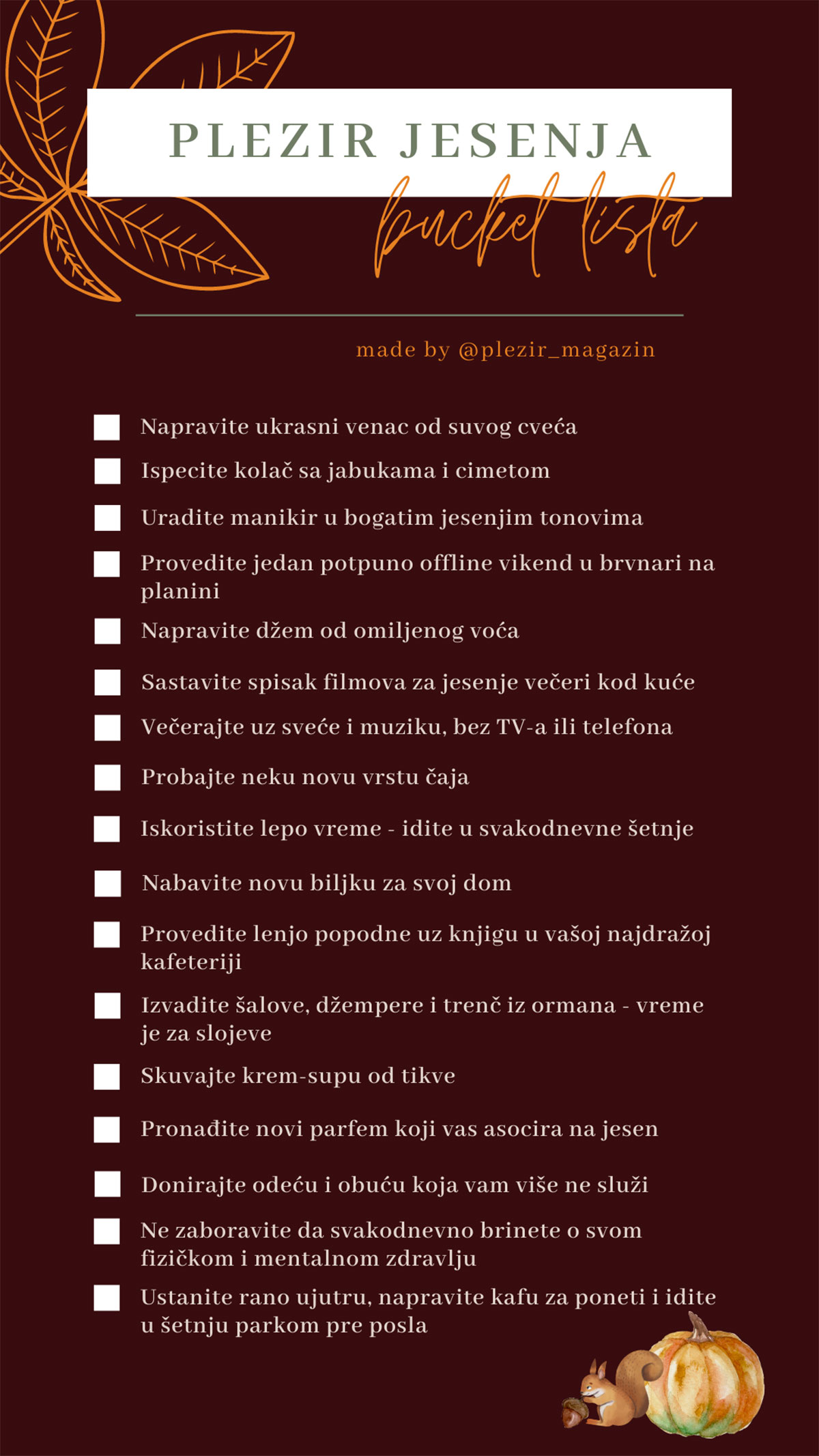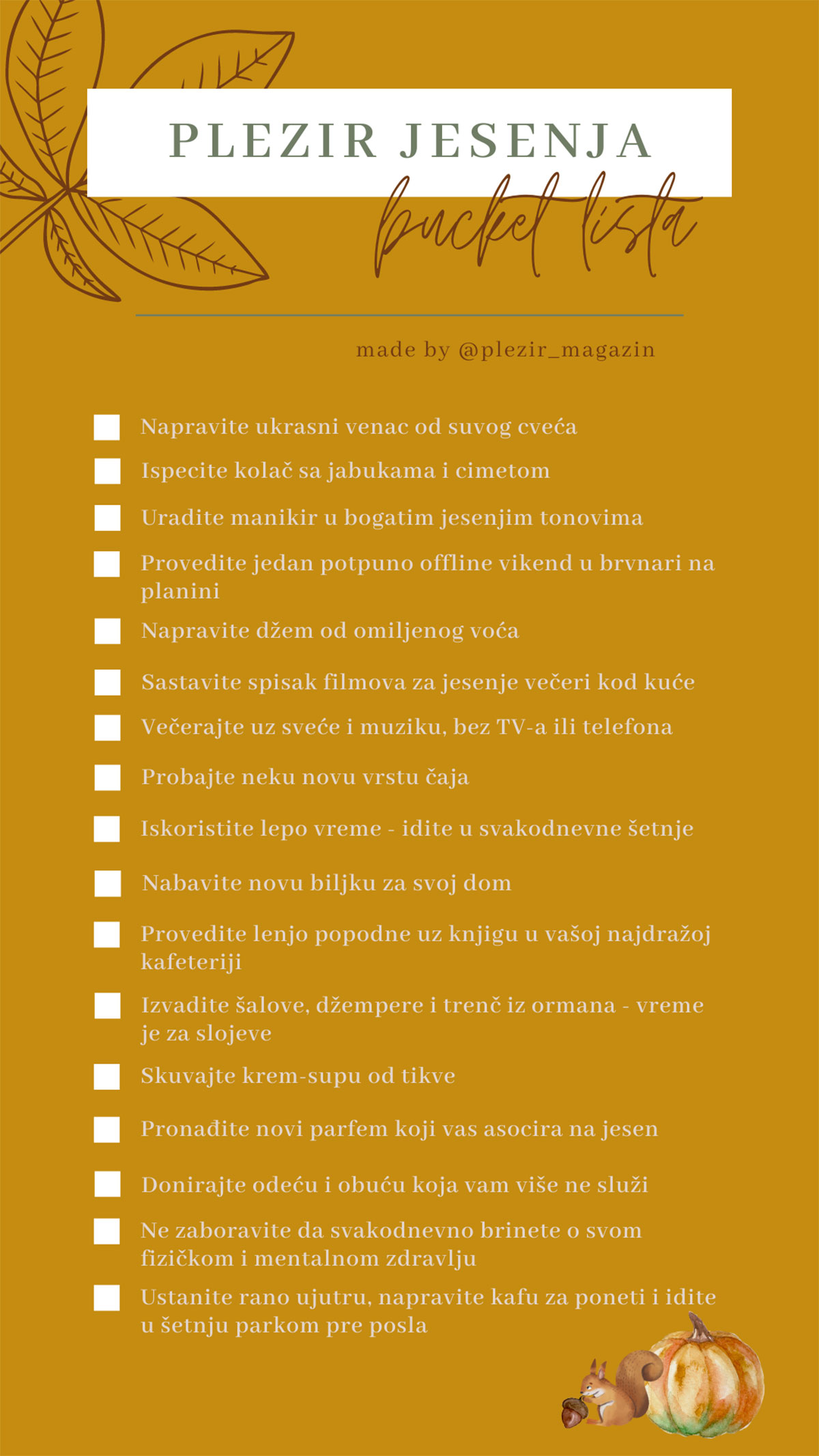 Nakon letnje bucket liste koja je pobrala vaše simpatije, sa prvim danom jeseni spremili smo vam i našu jesenju bucket listu. Skroz ušuškana, hedonistička, sa pozivom da se brinemo o sebi, kako fizičkom tako i psihičkom zdravlju – baš plezirska! Nadamo se da će vam naša ista biti dobar putokaz u stvaranju lepih uspomena ove jeseni.