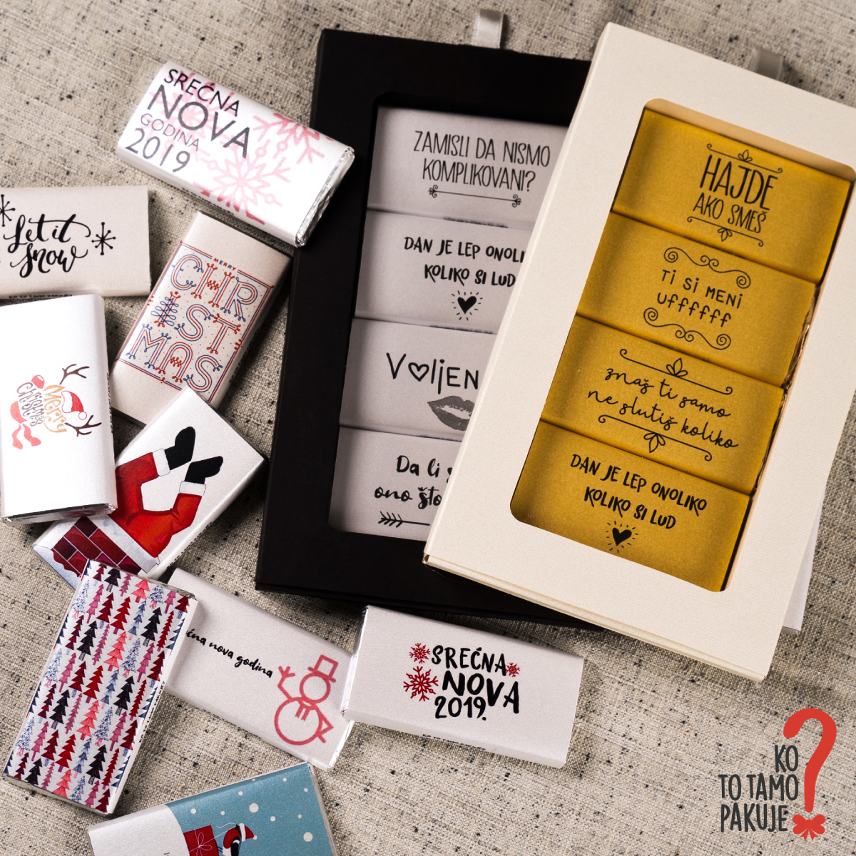 Asortiman i ideje su ono što neprestano istražujemo i na čemu radimo. U skladu sa tim, odlučili smo da malo zasladimo ponudu i to čokoladicama sa porukama koje vas sigurno neće ostaviti ravnodušnim, bilo da će vas zasmejati, raznežiti, ohrabriti. Zamislite da vas ovih hladnih, snežnih dana na stolu sačeka čokoladica sa natpisom: „Ko ti greje srce?”, ostavljena upravo od strane osobe koja to čini. Sada zamislite mogućnost da voljenoj baki, ili tetki, mužu, sestri poručite nešto lično upravo na čokoladici. Sve to je izvodljivo kod nas, zato budite kreativni, rečiti i ne časite časa.