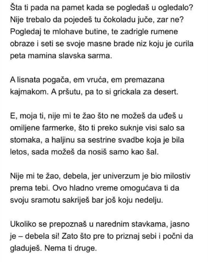 Ovakvi tekstovi se mogu naći uglavnom na lajfstajl platformama i u magazinima, ali mene brine što su te rečenice produkt žene upućene ženi. Bez imalo ustručavanja. Iako je redakcija pokušala da se ogradi time da je tekst, navodno, humorističke prirode, da li je zaista dopustljivo da u javnom prostoru na ovakav način definišemo nečiji potencijalni problem ili način života, i da delimo ovakve savete? Šta je sa empatijom? Šta je sa podrškom, jer žena koja je gojazna možda prolazi kroz depresiju, možda ima hormonalni problem, možda je genetska predispozicija učinila svoje, a možda samo želi taj višak kilograma. Šta je sa neprijateljstvom jedne žene ka drugoj?