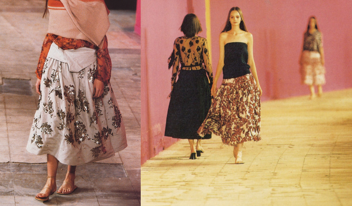 Jedan od izuzetno značajnih doprinosa tom i takvom iscrpnom istraživanju ženstvenog, svakodnevnog i nosivog jeste njegova kolekcija za proljeće/ljeto 2000. godine. Za početak: Van Noten je samo za tu jednu kolekciju kreirao 65 suknji, i to već mnogo govori o njegovim naporima da se približi ženi. Nijedna od njih nije ista, mada su sve približne dužine (preko koljena), budući da je više nego iko drugi svjestan šta za siluetu znači centimetar više ili manje. Većina njih su zamišljene kao balon, ciganske suknje, od prozračnih, laganih materijala – biće to jedan od komada koji će se nositi sezonama nakon što ih je on prezentovao. Drugi tip su nešto uže suknje, malo teže ili kruće, ali podjednako prozračne i jednostavne. Neke od njih imaju na sebi print – jednu od tipičnih odlika Dries-ovog dizajna koji je oduvijek njegovao naklonost ka uličnom, istorijskom, seljačkom, naivnom i etno, uz svu svoju ljubav prema cvijeću. Neke od njih su jednobojne, ali odmah treba reći da njegove boje nisu samo boje. One u sebi imaju to čvrsto, zemljano, prizemno. Neobične nijanse, uvijek nekako uprljane, uvijek nekog zaglušujućeg intenziteta, uvijek kao iznošene, sa nanosima života, sa svakom emocijom koja se da zamisliti. Neki osjećaj prošlosti i istorije izbija iz svega što stvori, nostalgija ali bez površnosti, teška i iskrena.