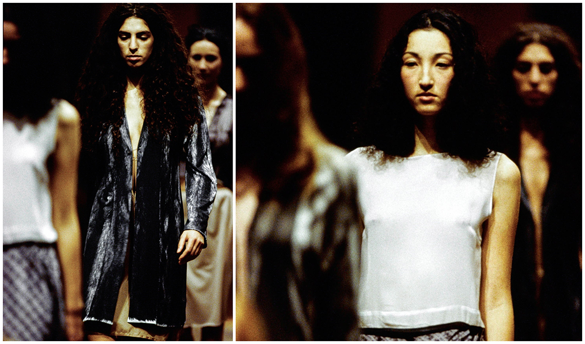 Moguće je međutim dekonstruktivizam i bezlično u njegovom radu pratiti i drugom linijom, „odozdo“, od samih kolekcija i odjevnih komada. U tom je smislu za istoriju mode bitna kolekcija za proljeće/ljeto 1996. godine, jer se tada i jedno i drugo eksplicitno javljaju i prožimaju. Budući da je Margielin rad zaista građenje svijeta oko odjeće, logično bi bilo početi od samih komada; ipak, teško je odmah se ne osvrnuti na samu atmosferu revije, zabilježenu na par loše očuvanih snimaka. Naime, radi se o modelima kojima pomoćnici u bekstejdžu lijepe trakom donji dio cipele za nogu, jer su njegove čuvene „tabi“ cipele ovog puta top-less; o brižljivom šminkanju modela da bi im se lice potom sasvim pokrilo tkaninom; o navijačicama koje skaču na početku revije i urliču dok je svuda muk – nema muzike – i manekenke se tako prekrivenih glava i cipela zalijepljenih za noge polako kreću kroz masu, niz stepenice gore i dole; radi se i o vrlo intimnom trenutku sramežljivosti kada djevojke na kraju revije izlaze još jednom da pozdrave publiku, ovog puta bez maski na glavama, poneka bez majice, s rukama koje stidljivo sakrivaju grudi. Pitanje ličnog i bezličnog, slobode i stida, tišine i buke: sve je to postavljeno već u načinu saopštavanja kolekcije, u samom konceptu. To je nešto po čemu je Margiela poseban i otuda nazvan „modnim dizajnerom modnih dizajnera“, jer su u njegovom radu ideja i dizajn zaista nerazdvojni.