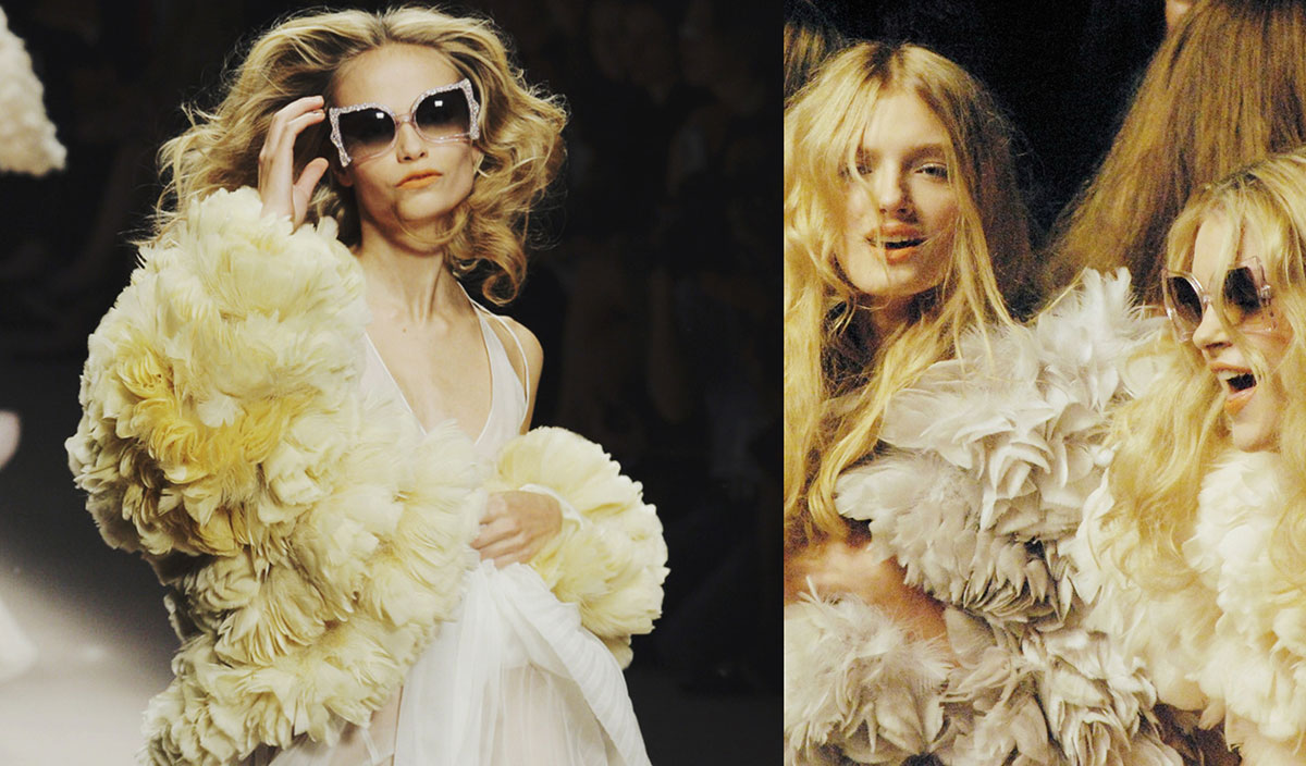 I zaista je tako – to je kritika koja ovakvom tipu mode mora biti upućena. Nije tu u pitanju samo socijalna (ne) aktivnost i zatvaranje očiju, te prazno i licemjerno moralisanje na račun toga, već redukovanje mogućnosti mode na svoj stereotip, hranjenje stereotipa, slavljenje stereotipa. Pa ipak, uz sve zamjerke koje se mogu pripisati ovoj modnoj kući, a posebno tokom dvijehiljaditih, ostaje činjenica da je kolekcija prikazana s kraja 2007. godine izuzetno lijepa. I to lijepa na onaj klasičan način, lijepa onako kako se poželi da moda bude lijepa kada ode u svoju drugu krajnost gdje od ganjanja socijalne i druge pravde izgubi svoju esenciju koja se ipak zasniva na odjeći, na potrebi za kvalitetom, ljepotom, ukusom, stilom, i tako dalje. Kolekcija je raznobojna, a odjeća tipski raznolika: u njoj su se našle i žuta i crvena i narandžasta i nijanse bijele i bež, i mantili i haljine i suknje i džemperi i mekane, pastelne, clutch torbe, i crna, i koža, i perje. Muzika je poletna, prvo ulična, pariška, topao ženski glas, osmijeh uz hod, a onda Mick Jagger i djevojke koje plešu i bezbrižno skaču dok Sonia i njena kćerka Nathalie izlaze da pozdrave publiku koja im pruža glasan aplauz i vrisak ovdje-ondje. Kolekcija se vizuelno i po tipu može podijeliti u dva dijela. Prvi, u jarkim bojama, tu gdje dominiraju mantili, pencil suknje, šeširi, dosta kežual, i nekakav britanski prizvuk ispod francuskog pristupa modi. Drugi dio kolekcije je sav svijetao i nježan, bajkovit, sa cvijećem u kosi i perjem na ramenima, pozivajući se na modno nasleđe kuće sedamdesetih. Sastoji se od providnih bijelih i bež haljina slojevito ukrojenih, dugih, grudi koje se vide kroz svijetlu tkaninu, tkanine koja se pribija uz tijelo, koja ga miluje, ukršta se oko nogu i liči na draperije sa antičke grčke skulpture… U takvoj modnoj viziji gubi se veza sa realnošću tako jaka na početku revije; djevojačke, snolike i duge raspletene kose sada dolaze do izražaja, a plesni pokreti uz lepršavu odjeću daju utisak da se gleda „Labudovo jezero“ u jednom modernom, modnom izvođenju.